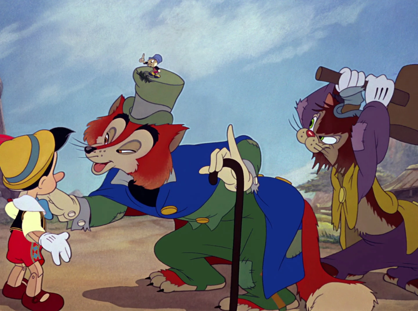 En Pinocho, Gedeón y el Honrado Juan están dando un paseo por el pueblo; durante el cual, el Honrado Juan se fija en un cartel que anuncia al famoso titiritero Strómboli. El dúo recuerda la época en que el Honrado Juan hizo pasar a Gedeón por una marioneta para estafar al titiritero, a lo que Gedeón accede con una expresión de timidez. Al reanudar su paseo, ven una marioneta viva, Pinocho. El Honrado Juan rápidamente formula un plan para vender a Pinocho a Strómboli. Gedeón intenta dejar inconsciente a Pinocho con su mazo, pero el Honrado Juan opta por un método menos cruel. Convence a Pinocho para que se convierta en actor y, al son de "Hi-Diddle-Dee-Dee", se dirigen a la caravana de Stromboli. Pepito Grillo intenta detenerlos, y aunque el Honrado Juan no se da cuenta, Gedeón sí lo hace después de ser engañado brevemente por el grillo para que se quede callado. Gedeón saca un mazo con la intención de aplastarlo, se cuela sigilosamente en la espalda de Juan y levanta su mazo, pero su sombra proyectada sobre Pepito lo delata, y Pepito salta del sombrero de Juan en el último momento, haciendo que el gato golpee inadvertidamente a Juan en su lugar. Al darse cuenta del error y temiendo las repercusiones, Gedeón le entrega a Pinocho el mazo y huye rápidamente. El Honrado Juan le grita furioso a Gedeón que le ayude, a lo que el gato responde utilizando el bastón de Juan para fijar el sombrero al suelo y golpeando a Juan de nuevo con el mazo, la fuerza finalmente libera al zorro del sombrero, pero también le hace volar a un charco cercano. Tras recuperar la compostura, los dos estafadores encuentran a Pinocho y lo convencen de nuevo para que vaya con ellos a la caravana de Stromboli, donde consiguen vender al niño al titiritero.