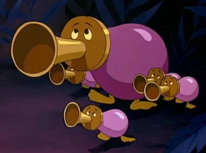 Son unos patos con forma de bocina. Hacen un sonido de bocina similar al de unos patos. Ellos son una familia formada por la madre y sus hijos.