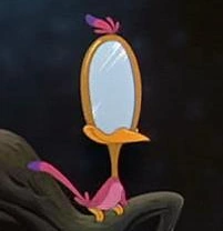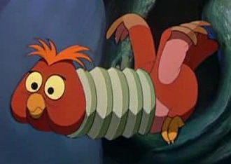 Uno de ellos se posa con sus patas en los hombros de Alicia, la cual no se da cuenta de que lo tiene encima hasta que se ve con él reflejada en un Pájaro Espejo.