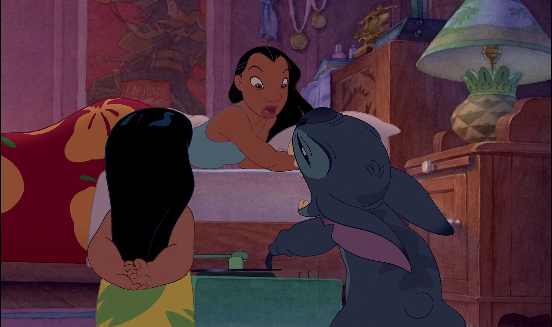 • El cartel en salas de cine original para Mulan hace un cameo en el dormitorio de Nani en Lilo & Stitch.