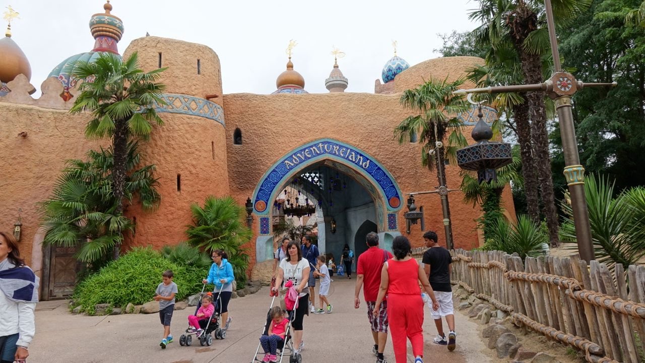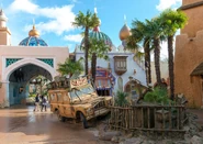 - Le premier, connu sous le nom d'Adventureland Bazaar, est une recréation d'une ville orientale des 1001 Mille et Une Nuits, vraisemblablement Agrabah du film Aladdin de Disney en 1992 (les Imagineers concevaient la zone d'entrée de cet Adventureland alors que le film était encore en production). En 1993, l'attraction Le Passage Enchanté d'Aladdin a ouvert dans cette même zone. Le concept de la ville a fini par atteindre les stations balnéaires d'outre-mer.