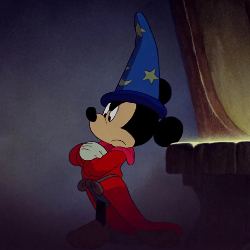 L'Apprenti apparaît dans la troisième séquence animée du long-métrage, qui reprend la symphonie de Paul Dukas, interprétant l'élève d'un sorcier, ayant alors pour tâche de transporter l'eau du puits. Fatigué, il admire les prouesses et facultés magiques de son maître qui réussit à modeler dans l'air un gigantesque papillon lumineux et coloré. Le sorcier allant se coucher, et ayant au préalable laissé son chapeau magique sur la table, l'Apprenti en profite pour le lui emprunter à son insu. Avec, il anime un balais, lui créant des bras, et fait en sorte qu'il transporte lui-même l'eau du puits. Le balais s'acquittant de sa tâche, l'apprenti sorcier en profite pour faire un somme sur le siège de son maître, et rêve qu'il est au dessus d'une falaise et est capable de contrôler les divers phénomène naturels, provoquant un orage et commandant les vagues. À son réveil, l'élève retrouve les lieux inondés, le balais effectuant son travail mécaniquement, et ne pouvant en conséquence s'arrêter. Voyant que la magie n'opère plus sur les agissements du balai, l'Apprenti décide d'y mettre un terme par la force en le détruisant avec une hache. Las, il est vite rattrapé par les événements lorsque les morceaux éparpillés prennent vie et créent une multitude d'autres balais qui s'empressent de transporter l'eau du puits. Faisant alors face à un véritable raz-de-marée, L'Apprenti trouve refuge sur un grimoire, cherchant par la même occasion une manière de stopper la catastrophe, jusqu'à être finalement pris dans un maelström. Le magicien arrivant sur les lieux rompt le désastre en balayant l'eau avec des gestes de bras. L'Apprenti sauvé, il rend son chapeau et le balais à son maître, lui souriant pour atténuer sa colère, et reprend les sceaux pour retourner à son travail, le sorcier le frappant avec son balai.