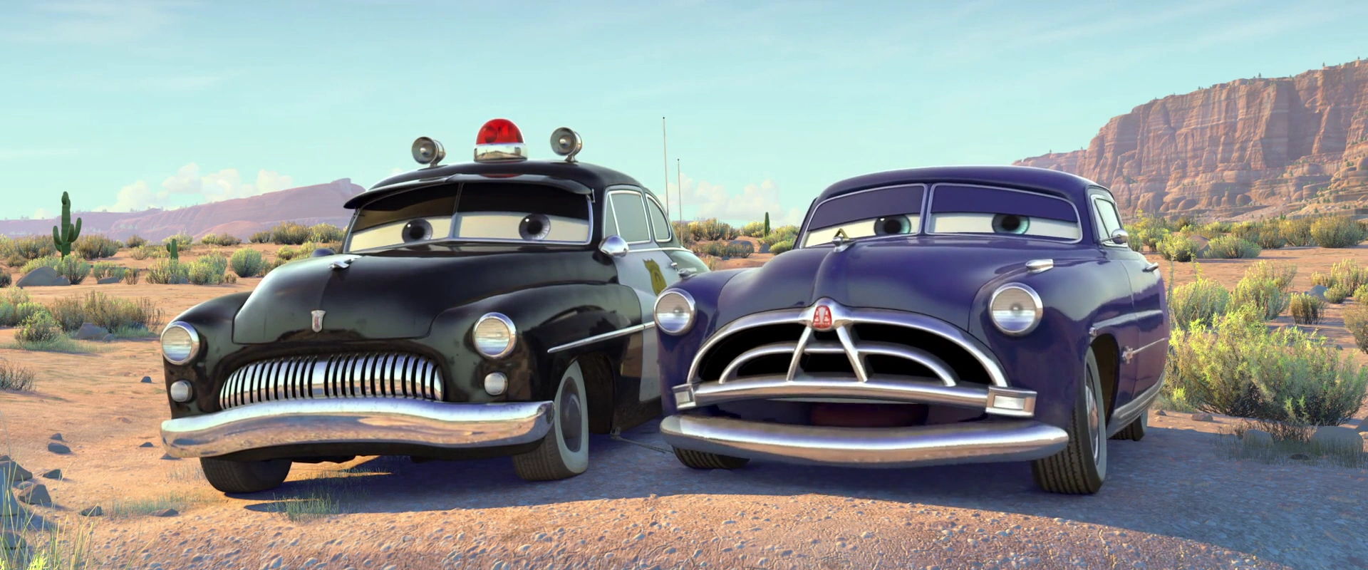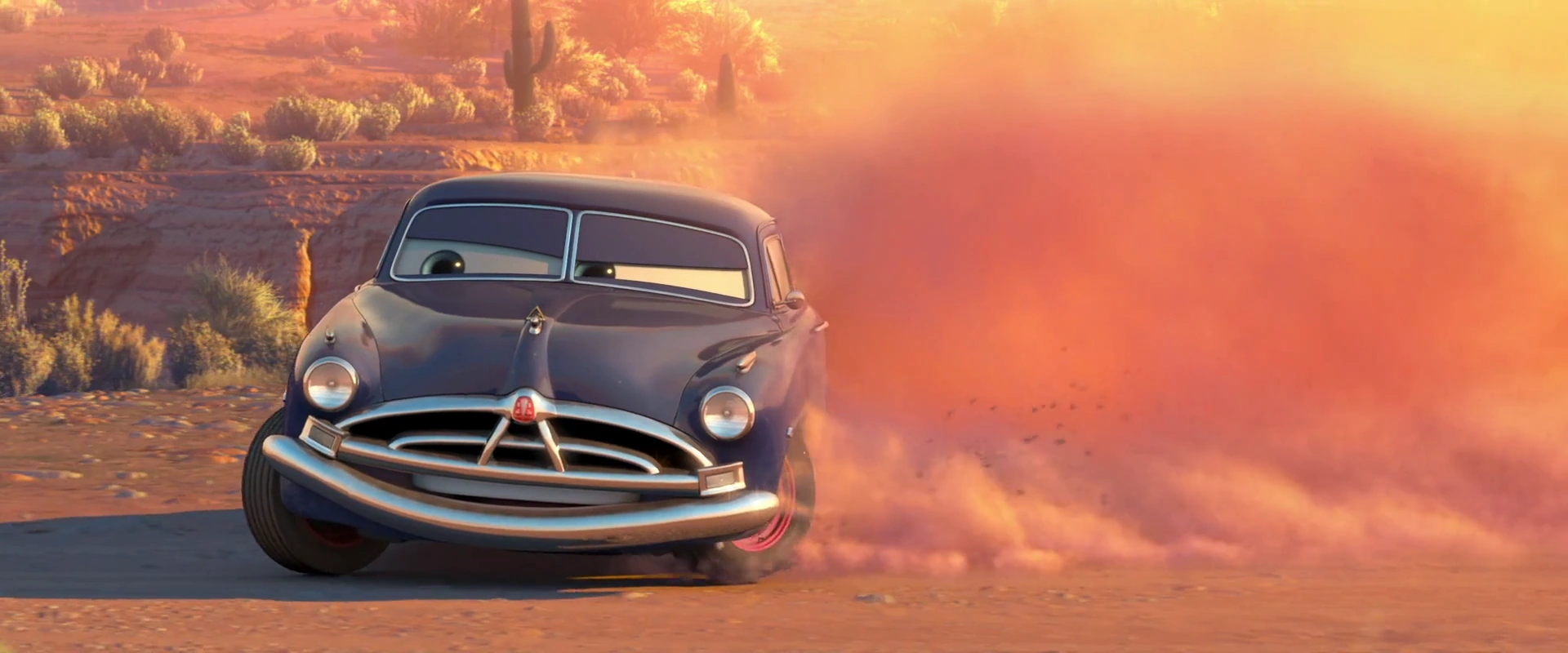La course a lieu dans la butte d'un désert, non loin de Radiator Springs. À l'insu de McQueen, le circuit comporte un virage serré sans aucun type de barrière qui risque d'entraîner les coureurs dans des cactus. Anticipant que son jeune adversaire ratera ce virage en raison du fait qu'il est trop habitué à l'asphalte, Doc décide de ne pas prendre le départ de la course, à la confusion des autres habitants, qui observent tout cela. Tandis qu'il se dirige lentement vers McQueen, le médecin demande au dépanneur Martin de l'accompagner. Lorsque le binôme rejoint Flash, qui a effectivement atterrit dans les cactus, Doc se moque de lui en lui disant qu'il conduit comme il répare les routes, puis laisse à Martin le soin de le remorquer et de le ramener en ville. C'est ainsi qu'un Flash très énervé travaille une bonne partie de la nuit suivante pour réparer la route, surveillé en permanence par le vieux policier Shériff. Doc regarde Flash travailler péniblement, puis rentre se coucher en commentant brièvement une musique.