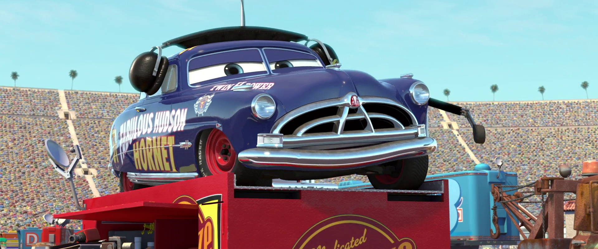 Lors de la course, McQueen est tellement triste d'avoir été séparé des habitants qu'il n'est pas concentré dans sa course et prend du retard sur ses deux adversaires, Strip Weathers et Chick Hicks. Il découvre bientôt que Doc a décidé de se racheter en emmenant la plupart des habitants à la course pour le soutenir. Il a même arboré ses inscriptions d'antan. Ainsi, Doc est son nouveau directeur technique et le conseille durant la suite de la course. Au cours de la compétition, il est remarqué par le public et les annonceurs et reçoit donc les applaudissements pour son retour qu'il a attendu durant près de 50 ans. À la fin de la course, Weathers est accidenté à cause de Hicks et Flash voit cela sur un écran géant et décide donc d'abandonner la victoire pour aller secourir le vieux coureur, s'étant souvenu de l'accident subit par Hudson Hornet. Ce geste touche profondément Doc et il félicite Flash une fois la course terminée.