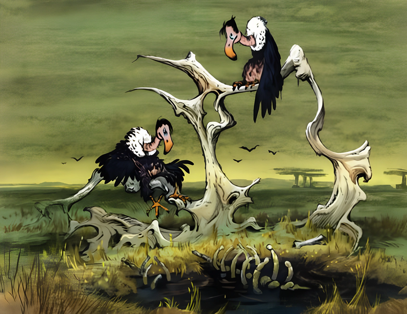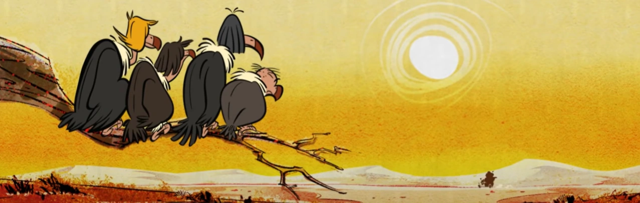 Malgré leur rôle naturel de charognards — consistant à se nourrir des cadavres d’animaux récemment morts — les vautours sont des oiseaux au caractère à la fois drôle et bien développé. Un gag récurrent souligne l’immense ennui qu’ils éprouvent régulièrement : ils posent sans cesse la question « Qu’est-ce qu’on va faire ? », à laquelle l’un répond « Je ne sais pas, que veux-tu faire ? ».