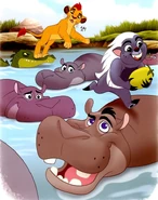 Makuu é visto dormindo pacificamente na água perto de alguns hipopótamos. No entanto, Bunga pula sobre sua cabeça enquanto joga Baoba bol, acordando-o imediatamente depois que ele pousa no nariz. Quando Kion se aproxima pouco depois que seu amigo se afasta, Makuu se vira e rosna, assustando o jovem filhote