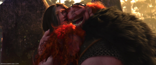 Merida, Elinor e Fergus se abraçam, depois do fim da maldição.