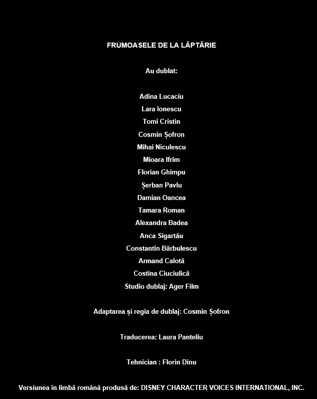 Versiunea în limbă română produsă de: DISNEY CHARACTER VOICES INTERNATIONAL, INC.
