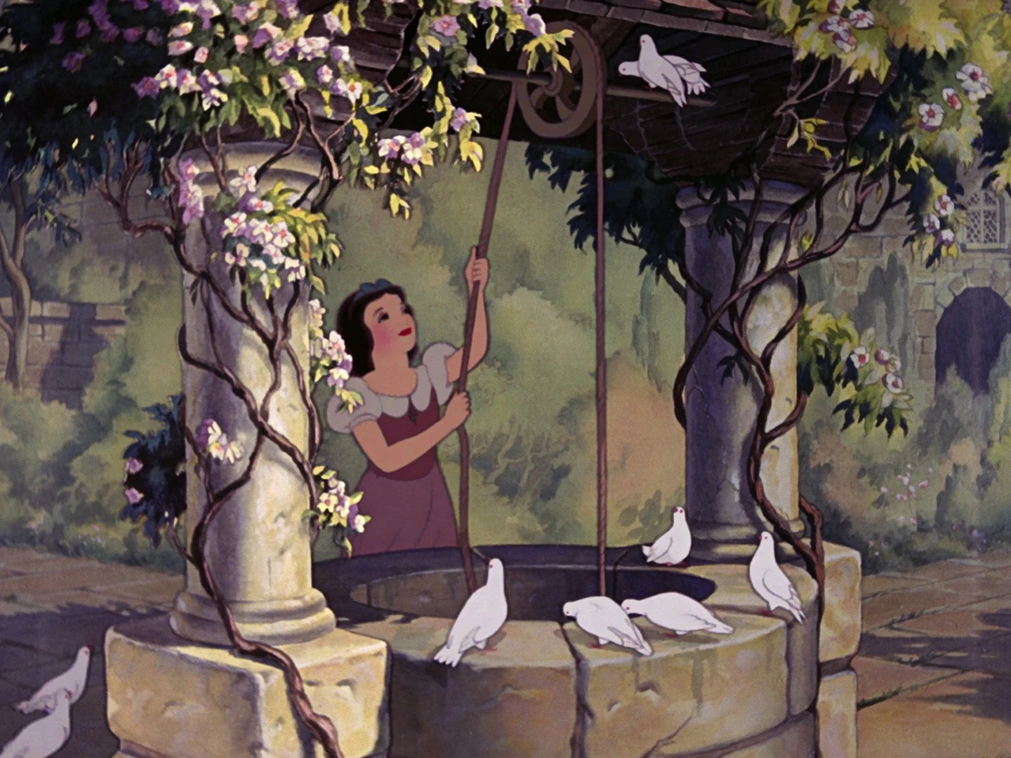 - Уста алые, как розы, кудри чёрные, как смоль, кожа белая, как снег — Белоснежка олицетворяет собой всё самое прекрасное, чистое и доброе. Несмотря на то, что Злая Королева заставляет её облачиться в лохмотья и работать посудомойкой, Белоснежка по-прежнему заботлива и добра ко всем, а главное — она продолжает верить в то, что её мечта исполниться и однажды к ней придёт её Прекрасный Принц. После того как ей приходится сбежать от злой мачехи-королевы, Белоснежка встречает семерых гномов, для которых она становится учителем, опекуном и верным другом. И хотя коварной Королеве удаётся её околдовать, мечта Белоснежки всё-таки сбывается — появляется Прекрасный Принц и спасает её.
