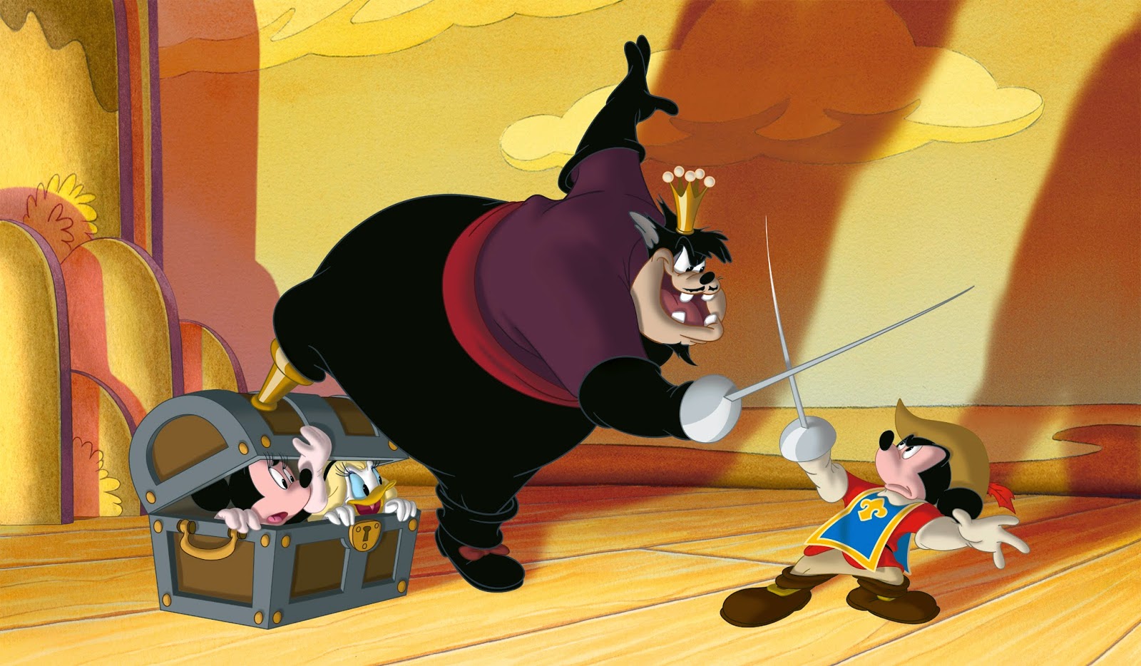 Рисунок, изображающий Пита, сражающегося с Микки, удерживая Минни и Дейзи в плену в фильме «Микки, Дональд и Гуфи: Три мушкетера (2004).