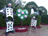 The hedge maze is themed around scenes and characters from the Disney 1951 animated feature film Alice in Wonderland. It comprises two sections: the first one with some of Alice's adventures prior to meeting the Queen of Hearts, and the second based on Alice's encounter with the Queen, who had a similar labyrinth in the film.