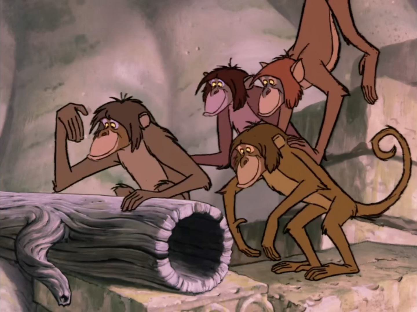 The Bandar-Logs first appear near the end of the song The Bare Necessities, spying on Mowgli. Shortly afterward, they abduct him, although Baloo tries to rescue him. The monkeys take Mowgli to their king at the ancient ruins. King Louie offers to let Mowgli stay in the Jungle if he can teach him (King Louie) how to make fire through the song I Wanna Be Like You. During the song, the monkeys dance with their king around the ruins until Baloo and Bagheera show up to rescue Mowgli. When King Louie dances with "a girl orangutan," he pats her on the back, revealing that it was actually Baloo in disguise. While Baloo and Bagheera rescue Mowgli, King Louie and his monkeys work to try to get Mowgli back. During the chase, a stone pillar is knocked out of place and the building it supports begins to collapse. Louie holds it up, Baloo tickles him and the monkeys come to help. They use a battering ram to knock Baloo out of the way. When hit, Baloo lurches forward, knocking Louie into another pillar, breaking it. Baloo leaves Louie to hold up the collapsing building. After Mowgli, Bagheera, and Baloo escape, King Louie and the monkeys are not seen for the rest of the movie.