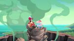 In the episode "The Sneaky Snook-Off ",Captain Hook and Beatrice Le Beak challenge each other in various contest to determine who is the sneakiest pirate within Never Land. A race to the top of Belch Mountain was the first challenge between the villains. Le Beak gets a huge advantage in the race, using the whirly-hook she stole from Hook to cheat. After reaching the top of the volcano, Le Beak brags about beating Captain Hook in the first challenge.
