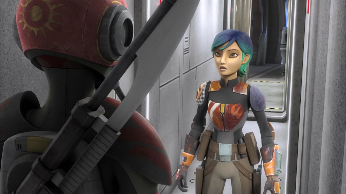 Meanwhile, Sabine and Chopper are now out in space, and despite leaving Ezra behind they proceed with the mission in getting EG-86 to the rendezvous point. Then just before making the jump to hyperspace, they detect Ketsu's ship approaching. She comes up from behind and opens fire on the shuttle, knocking out their hyperdrive. Sabine can guess what Ketsu's next move will be and orders both droids to lock their feet down. Ketsu comes up beside Sabine's shuttle and shoots the side door open, causing a haul breech. Chopper gets sucked into the vacuum of space, but EG-86 and Sabine get trapped in the doorway. With a bit of a struggle, Sabine manages to activate the force field, sealing the breech. Ketsu comes up face to face with Sabine's shuttle and makes contact. She threatens to blow her up unless she surrenders the droid. Little does she show that Chopper, after a moment drifting in space, is on her ship and proceeds in sabotaging her weaponry. Sabine sees this and keeps Ketsu distracted long enough for Chopper to disable her main cannon. While Ketsu expresses how proud she is to be part of the Black Sun, Sabine only shows disgust for almost having that life, as she knows the Black Sun are slavers and assassins who don't care about anything but body counts and quotas. They would also kill their own for a profit. After Sabine again refuses to hand over the droid, Ketsu regretfully opens fire on her old friend, but thanks to Chopper the guns are disabled. Sabine bids her farewell and hits the thrusters with Chopper in follow, but Ketsu captures him in a tractor beam and holds him hostage. Sabine turns back and docks with the Shadow Caster, agreeing to make a trade. Meeting face to face, Ketsu can see that Sabine is still not willing to give up the courier. She offers to split the bounty with her if she hands over the droid, but Sabine tells her she is no longer into making profits as she now part of the Rebellion's fight against the Empire. Ketsu shows little confidence that the Rebellion can overthrow the Empire and tells Sabine it's foolish to even try. To her, survival is what really matters and people cannot be trusted. Sabine tells Ketsu the Rebellion gave her a second chance in life. Back when she was only out for herself, she met good people who helped her become more that what she use to be and fight for a right cause. She forgives Ketsu for abandoning her and offers her a second chance. Just then, they receive a transmission form an approaching Imperial Vessel that has been tracking down the stolen shuttle and threatens to open fire if they try to flee. This issue forces Sabine and Kestu to work together once again.