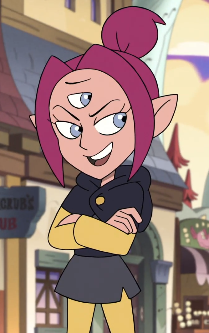 Boscha has a slender figure with pink skin, light grey eyes, and violet hair tied back in a bun. Like most witches on the Boiling Isles, she has pointy ears but also has a third eye on her forehead. When attending school, Boscha wears a gray tunic with a dark gray belt, hoodie, and boots. As part of the Potions track, the color of her sleeves and leggings are yellow.
