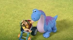 When Donny first brought Bronty home, Bronty was very excited to see Doc and Lambie, who were playing tea party. He starts to mess around the table, but Doc suggests that he should go outside where there is lots of space to play, and she and Lambie take him out into the garden. Bronty meets all the other toys and starts to play catch with them, a little roughly. He accidentally squashes Chilly, so Doc gives Chilly a check-up. Bronty accidentally squashes Stuffy into the ground, so Doc gives Stuffy a check-up after Chilly. Lambie comes into the clinic with a sore arm, so Doc kisses and cuddles her as well as Stuffy. The other hurt toys come into the clinic, so they get into a line and Doc and Lambie cuddle and kiss them. Bronty comes into the clinic and Doc explains to him that he is a great toy, but he is the one who hurt everyone, and feeling sad, Bronty runs out. The toys admit to Doc that Bronty was sad he hurt everyone and forgive him. Doc explains to Bronty one more time that it is okay to be big, even though he is the biggest of the toys, and he needs to be careful when he plays with his friends because they are smaller than him, like Doc needs to be careful when she is playing with Donny. After singing a song about being careful with smaller toys, Bronty understands the explanation and starts to play catch gently with the toys, and giving them a ride on his back.