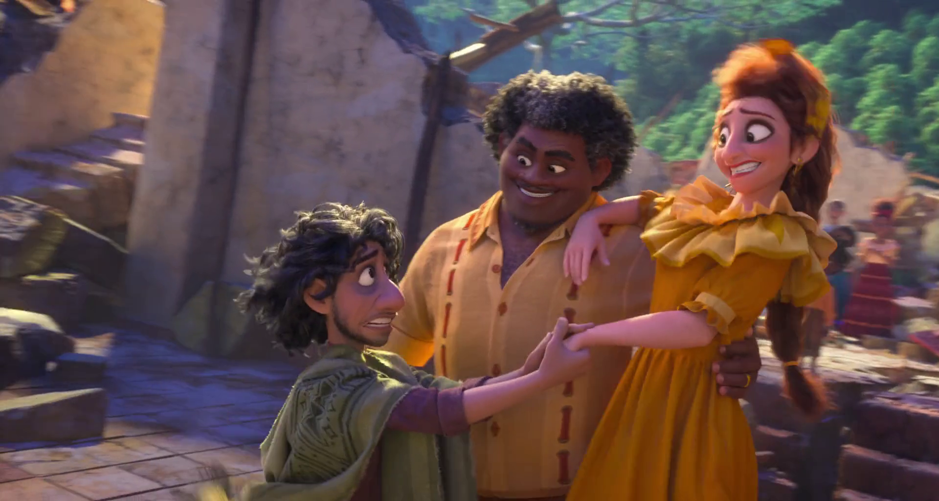 When the three return to the rubble of the Casa Madrigal, Bruno initially hides shy of reuniting with the rest of their family. In "All of You," he watches from hiding as his mother apologizes to the family for holding on too tight, fearing she would lose them too after losing Pedro, and redefining the miracle as just themselves rather than the magic. Bruno shyly approaches her as Alma calmly guides him to reunite with his sisters and he is immediately happy when they run to hug him. While most of the Madrigals are overjoyed by his return, others are surprised by his sudden appearance. Camilo expresses enormous confusion with his presence and his siblings' familiarity in the situation, says that the family needs to talk about Bruno, to which the latter agrees. Bruno then begins a string of apologies, including apologizing for Pepa's wedding and encouraging her to show her emotions freely, a sentiment Félix shared. When he attempts to apologize to Julieta for past indiscretions, his sisters and Agustín stop him and hug him as they express their joy that he is back with the family.