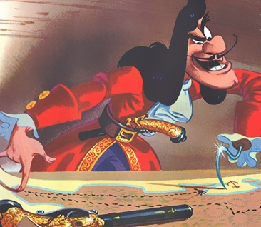 Captain Hook is the main antagonist of Disney's 1953 animated feature film Peter Pan. He is an elegant, yet dastardly pirate that commands the Jolly Roger, a brig docked on the shores of Neverland. Hook has long since abandoned sailing the high seas in favor of having revenge on Peter Pan for cutting off his left hand and feeding it to a crocodile, who has since been in constant pursuit of the captain. While a worthy opponent for Peter, Hook is destined to fail—sometimes because of Pan's ability to fly, but more often through the bumbling incompetence of his first mate, Mr. Smee.