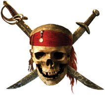 | The skull was redesigned in silver, though retaining its red bandana and crossed swords (in a nod to the first film's skull). The skull would talk in the trailer for the Disney Second Screen bonus feature and whenever the player chooses the "Play Movie with Disney Second Screen" option on the Blu-ray disc of On Stranger Tides, but not on the discontinued app based on this feature. It also appeared on the discontinued application Pirates of the Caribbean: Master of the Seas. | |