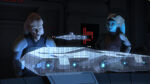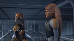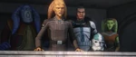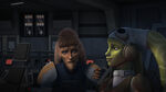 Cham, Numa, and Gobi later flee from scout troopers on Ryloth before being rescued by Hera. They learn that imperial officer Captain Slavin has taken over the Syndullas’ home as a base, causing Cham to realize that someone from higher up has been brought in to help the incompetent Imperials on Ryloth. Hera decides to sneak into the home to steal back her kalikori, a family heirloom. Ezra disguises himself as a scout trooper and takes her into the house pretending she is a slave he caught while he was on patrol. Slavin’s superior, Grand Admiral Thrawn, already knows everything about Hera and has her and Ezra captured.