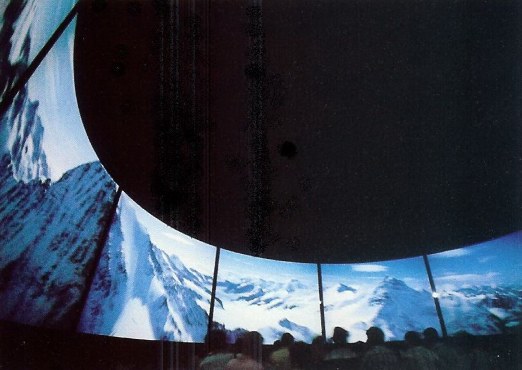 By using an odd number of screens, and a small space between them, a projector may be placed in each gap, projecting across space to a screen. The screens and projectors are arranged above head level, and hand bars may be provided for viewers to hold or to lean against while standing and viewing the film.