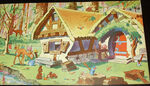 The forest animals sleeping outside the cottage in the morning.