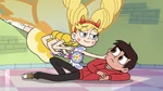 Back in the magic realm, Star has completely forgotten her name and everything else. Marco appears through the all seeing eye to tell Star to come home. She remembers and transforms; taking off through a portal back to her own room. Star arrives to see her room in disrepair, caused by Marco's attempt to enter the realm, but is glad to see that he and Janna are okay. Her wand reconforms to her and she reveals a new ability. Transforming between Mewman and butterfly forms at will. When Marco expresses some slight reluctance that Star's problems are not over, she and Janna put him to sleep with "chickenbutt".