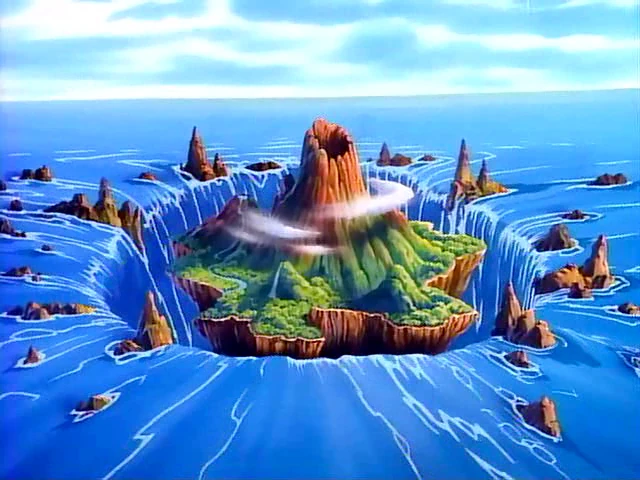 Gusto Gummi had known about the island and set sail for it, presumably starting from his warren. Gusto intended a short stay on the island in order to paint the beach, but the following day the beach had been destroyed by a collapse into the ocean. Vigorous waterfalls surrounded the island, trapping Gusto. The island's most prominent physical feature was a volcano.