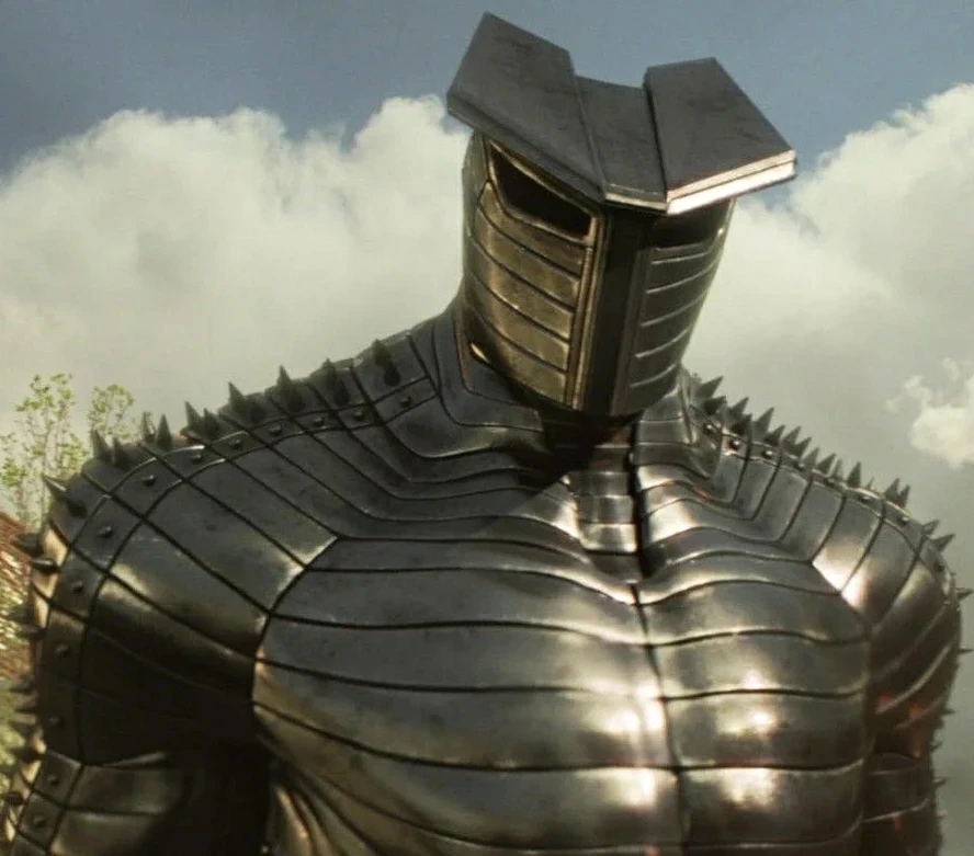 The Destroyer is an enchanted suit of armor that is lifeless until animated by a living being. It is covered in metal plating with a core in the center of its chest and has sets of spikes on its sides. Its head has a U-shaped plate on top of it and a vent-like visor where it can emit energy from. Two glowing eyes are also present above the visor..