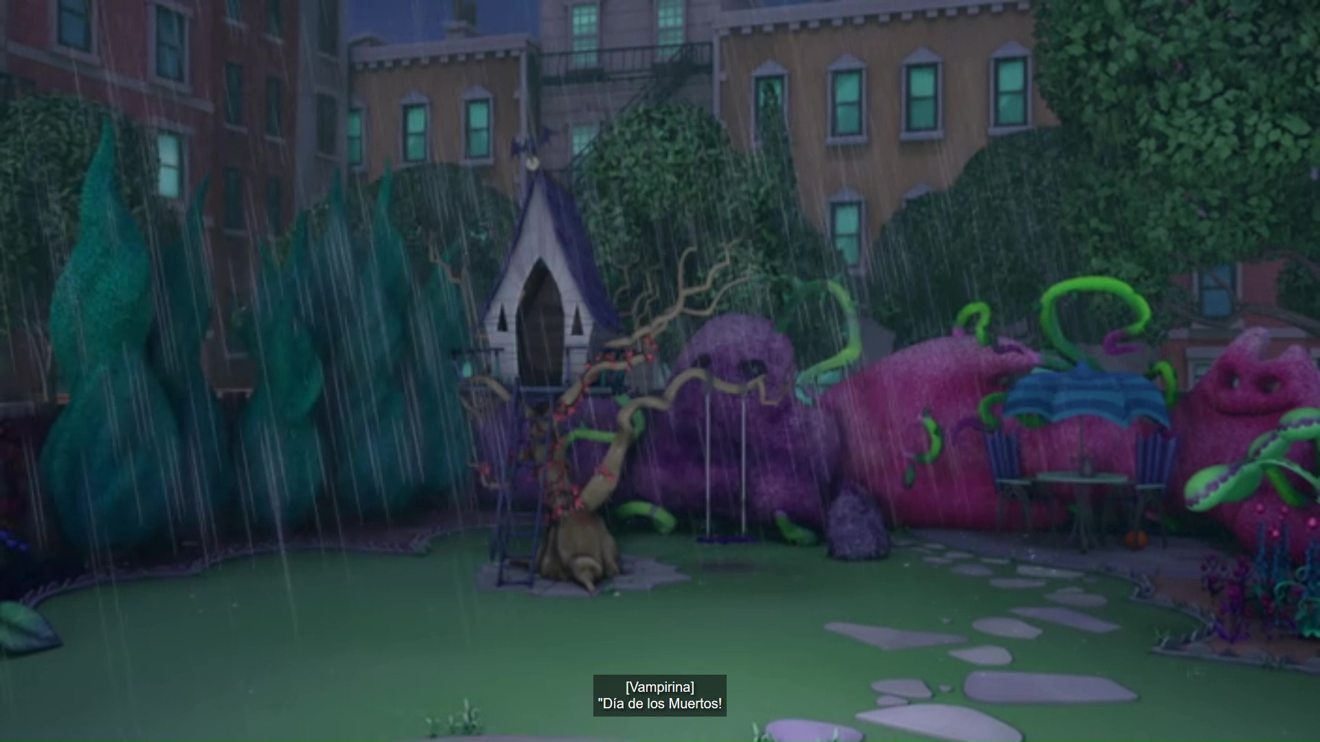 Raquelita tells Vampirina that first they need to make an ofrenta: The altar. Raquelita explains that a Día de los Muertos altar it's where you place things that were special to your loved ones who have passed on, you talk about them, remember them and they visit you. Demi gets excited when she hears they'll have company and asks how he looks, to which Raquelita says "Guapo!". Vampirina asks what kind of things are put on the altar and Mama, Demi and Gregoria tell her that are placed on the altar things related to what the departed liked. Raquelita says they're going to dedicate a large part of the altar to her Abuelita Tita so that she can visit them and Vampirina decides to dedicate their altar to Great Uncle Dieter.