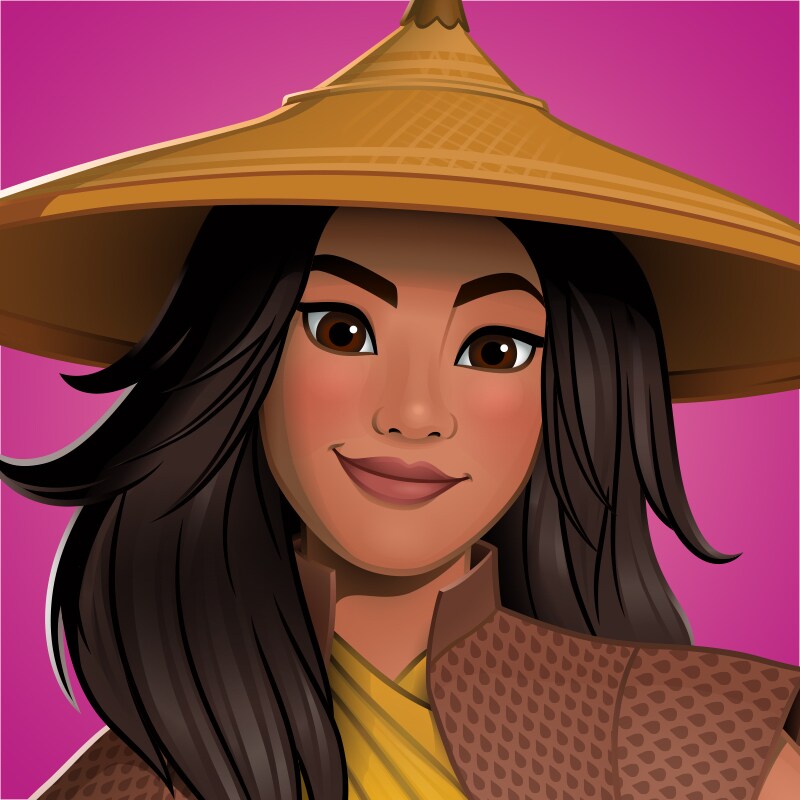 | The daughter of Heart's village chief, when her village was threatened by the Druun, Raya was trusted by her father to wake up Sisu and bring the world of Kumandra back together. She eventually finds the courage to do so, with the help of Sisu, Boun, Noi, Tong, and eventually, Namaari. In learning to trust, Raya gets rid of the Druun, and brings the five tribes together, becoming Kumandra once again.
