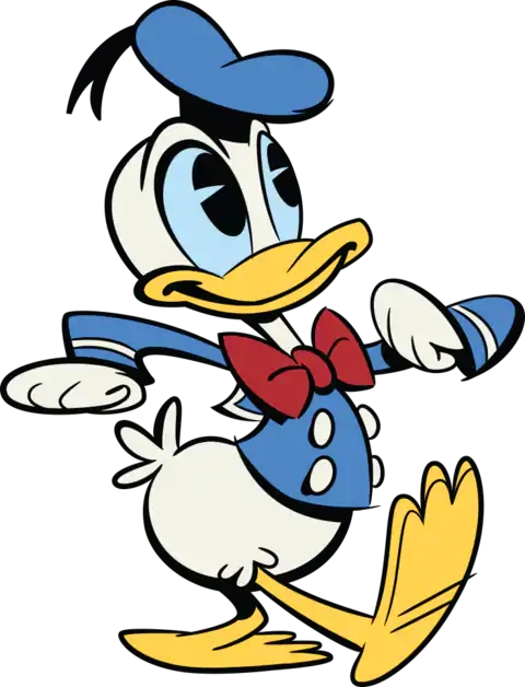 Donald is an anthropomorphic duck with white feathers, orange-yellow webbed feet and bill, with blue sclerae and black pupils. He is usually seen wearing a bright blue sailor shirt with yellow accents and a red bow tie, along with a bright blue puffy sailor hat that is soft, squishy, flexible, and elastic, with a black band wrapped around the base of the hat and a black ribbon tail with a simple "V" cut at the end hanging from the side, like the iconic Donald design everyone knows and loves today.