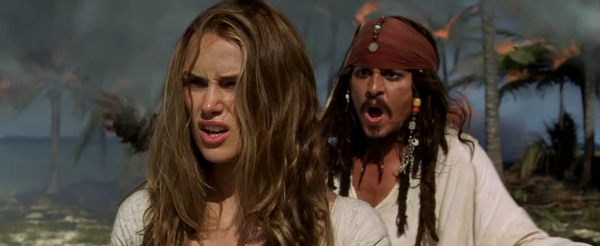 During the thrilling confrontation with Barbossa's pirates on Isla de Muerta, Elizabeth frees Jack's crew from the Black Pearl's brig, naively believing they will help rescue Will. Abiding by the Pirate's Code that, "any man who falls behind, is left behind," they instead commandeer the Black Pearl and set sail, leaving a disgusted Elizabeth to rescue Will and Sparrow alone. Prior to leaving, Elizabeth told them they were pirates and that they should "hang the Code and hang the rules," saying they were more like "guidelines," which she took from something Barbossa told her days prior. As Norrington's men battle the cursed pirates in the moonlight, Sparrow duels Barbossa inside the treasure cave, while Elizabeth joins Will in his own fight. Looking over, she watched as Barbossa and Jack slashed at each other, nothing more than skeletons in the moonlight. "Whose side is Jack on?" Elizabeth asked, upon seeing that Jack had taken on his old crew's curse. "At the moment?" Will retorted sarcastically. Will and Elizabeth then faced the remaining cursed crewmen. In the end, right when Barbossa pulled out his pistol and aimed straight at Elizabeth, a shot rang out. But it was not Barbossa's pistol that had been fired. Perplexed, Barbossa turned and looked at Jack Sparrow, who stood holding his smoking pistol pointed directly at Barbossa's heart. Jack had fatally shot Barbossa, who boasted about his immortality until Will opened his left hand, cut in his palm, and two pieces of Aztec gold fell with a clink into the filled chest. From where she stood, Elizabeth smiled before watching Barbossa turn back to Jack, a look of anguish on his face. Having reverted to mortal form as the curse is lifted, Barbossa fell dead. The surviving now-mortal pirates' surrender. Will, Elizabeth, and Sparrow are rescued, although Sparrow is later condemned to hang because of the Pearl being gone.