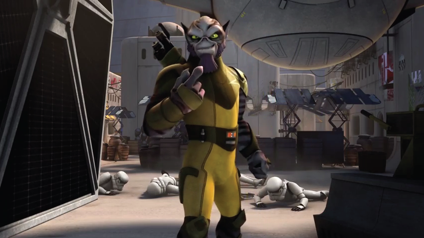 Zeb finds his way to a landed TIE Fighter. He takes out the pilot as the Stormtoopers begin to fire at him. They lose sight of Zeb, who is on top of the TIE fighter, until he jumps on one of them and engages the troops in a physical confrontation. He easily defeats the troops when the pilot of the fighter gets up with a gun pointed at him, ordering for reinforcements. Zeb outwits the pilot and takes him out just as more troopers arrive. As a result their random firing, a leak is sprung in the TIE fighter's oil tank and one laser blast at the highly explosive fuel causes the Fighter to blow up.