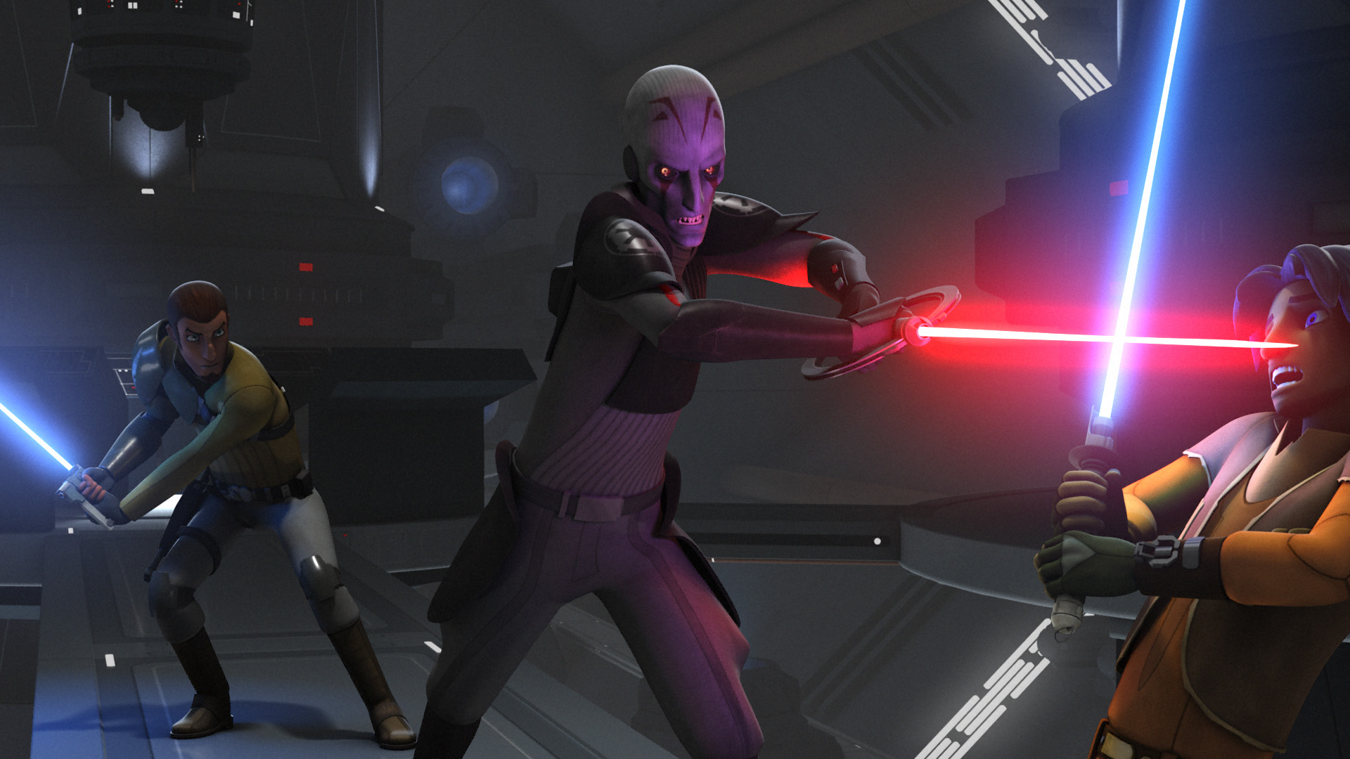Finally, the Rebels begin to approach the Star Destroyer, and Ezra confirms that Kanan is there. They send in Sabine's TIE Fighter, which sends out a pulse that cuts the power. The rebels sneak on board, trying to find Kanan, but Tarkin calls in reinforcements. The crew is forced to close off the door that is their only path to Kanan, but Ezra manages to climb into the air vents to get to him. He comes back through the air vents on the other side of the door, and finds Kanan and frees him. Ezra is supporting Kanan when they run into the Inquisitor. Kanan borrows Ezra's lightsaber and engages the Inquisitor in a fight. While they are dueling, Ezra notices that the Inquisitor has Kanan's lightsaber, and steals it from him. Kanan and Ezra then fight the Inquisitor using each other's lightsabers. The Inquisitor manages to knock Ezra off the platform. Kanan, enraged at what he believed was Ezra's death, picks up both lightsabers and begins to fight with twice the effort, saying the Inquisitor made a mistake, because now he had nothing left to fear.