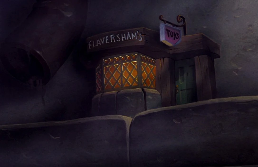 Flaversham's Toys is a simple shop filled with several elaborate clocks and toys, created by Mr. Flaversham. The night his daughter Olivia had her birthday, he was kidnapped by Fidget under Ratigan's orders.