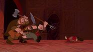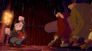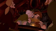 On their way to the Beast's castle, the mob managed to chop down a tree to use as a battering ram to force open the castle doors. There, Cogsworth and Lumiere led a surprise attack on the invading villagers to save the castle. During the battle, Dick (wielding an ax) found himself between a pair of drawers and prepares to strike, only to be knocked in the face between their slamming shelves. Later, he and Gramps attempted to subdue Wardrobe but were easily defeated: Dick being knocked out cold and Gramps being pulled inside Wardrobe's closet by a hairbrush and comb and being released dressed like a woman with woman’s hair and makeup, prompting him to flee the scene in fear and embarrassment. As for Tom, he yanked at Fifi's feathers, only for Lumiere to rescue her by burning Tom’s rear end, causing him to yelp in pain. Soon after, Tom, LeFou, and Stanley chase Sultan (who had stolen LeFou's left shoe) into the kitchen and prepare to kill him, believing they have him cornered. However, along with the other villagers, they finally retreated out of the castle after being scared away by living knives and the oven who raised his flames in a menacing fashion.