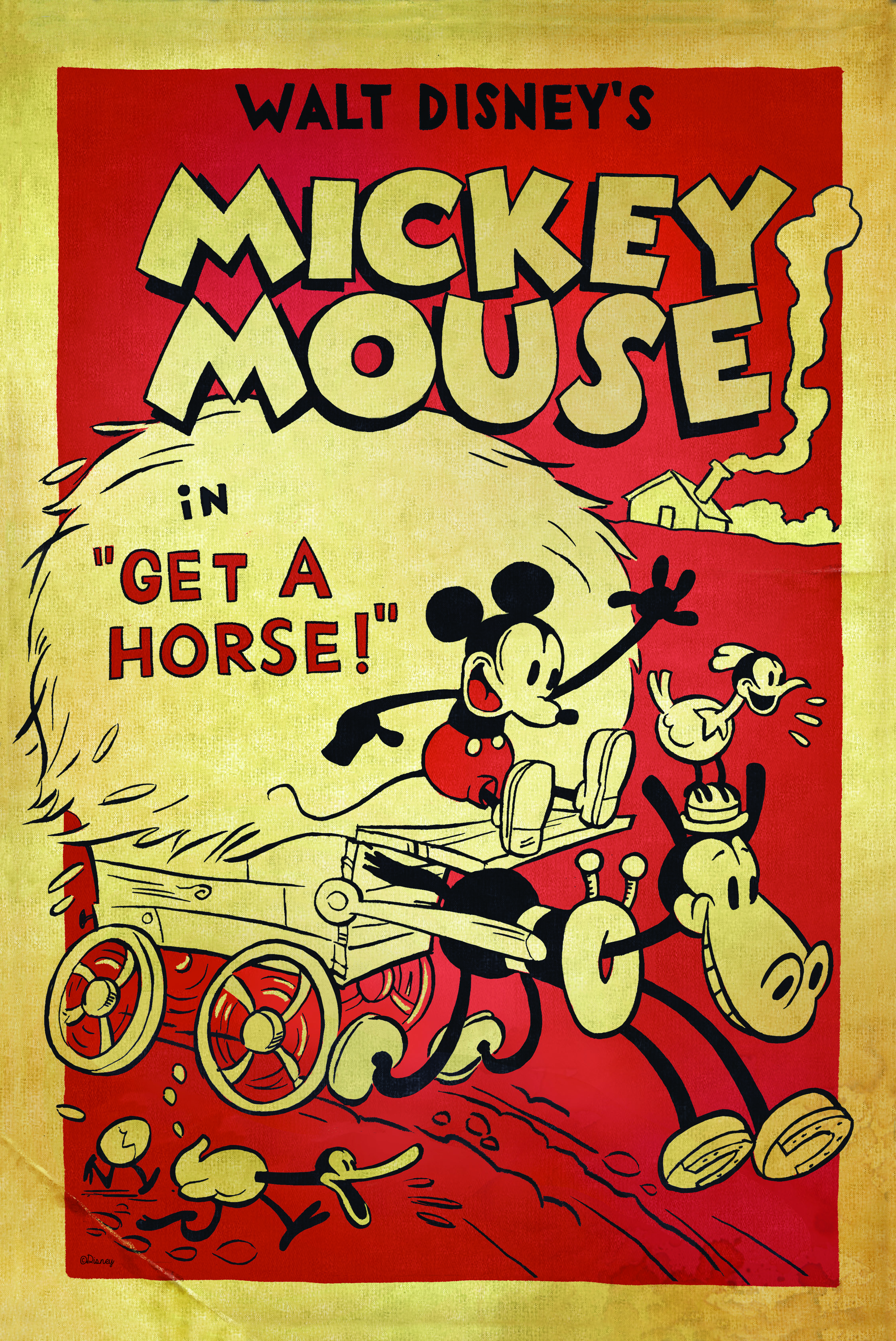 Get a Horse! is a 2013 American animated Mickey Mouse black-and-white/color traditional/CGI hybrid Walt Disney Animation Studios short film. The short features archival voice recordings of Walt Disney as Mickey Mouse.[1] It was nominated for the Academy Award for Best Animated Short Film of 2013, but lost to Mr. Hublot. It was also released in theaters on November 27, 2013 with Frozen.