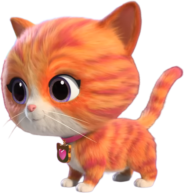 She's an orange American Shorthair cat with purple eyes and dark stripes. Compared to the other SuperKitties, she is tall. She wears a pink collar with the pink heart Super Kitty Call emblem on it. Her super suit and mask are pink and light blue.