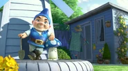 Gnomeo is first seen getting ready for the lawn mower race against Tybalt, the red gnome, with his friends Benny and Shroom. The race is to show which garden, the Red and the Blue, is the best. When it seems like Gnomeo is winning, Tybalt cheats by using a pipe to throw his mower out of control, having it get crushed by a car. Gnomeo decides to enter the Red garden with Benny to spray blue graffiti on the red gnomes' mower. The plan backfires when Benny goes off spraying Tybalt's wishing well instead and accidentally sets off the security system. Benny escapes over the fence without Gnomeo, but Gnomeo escapes using Mr. Capulet's underwear as a parachute, and lands in the old, abandoned garden.