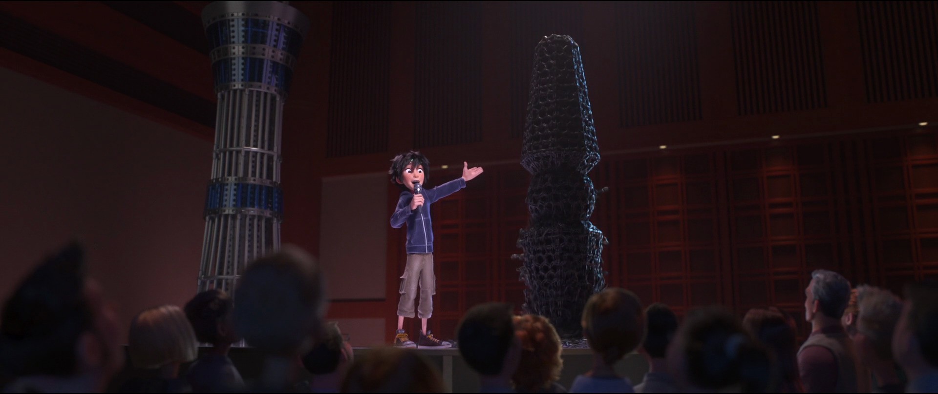 After the introduction, the two run into Professor Callaghan, a world-renowned robotics expert, mentor of Tadashi, and Hiro's personal idol. With the help of Tadashi, Callaghan cunningly convinces Hiro to enroll in the institute. According to Tadashi, the school holds an annual convention, where up-and-coming geniuses are meant to showcase new creations. Those who impress Callaghan are accepted into the school. Tadashi decides to help Hiro when he has trouble deciding what to invent. After a long period of work and planning, with the help of Tadashi, Go Go, Wasabi, Honey, and Fred, Hiro creates the Microbots—miniature robots capable of forming anything that comes to mind through the use of a telepathic transmitter. Hiro's presentation thoroughly impresses both Callaghan and famous tech-guru Alistair Krei. Krei offers Hiro vast wealth in exchange for ownership over the Microbots, but Callaghan interferes by accusing Krei of using technology for selfish reasons, advising Hiro to deny the offer. After some consideration, Hiro takes Callaghan's advice and refuses to sell the Microbots. A frustrated Krei leaves the scene while Callaghan congratulates Hiro on his success by granting him admission into the school.