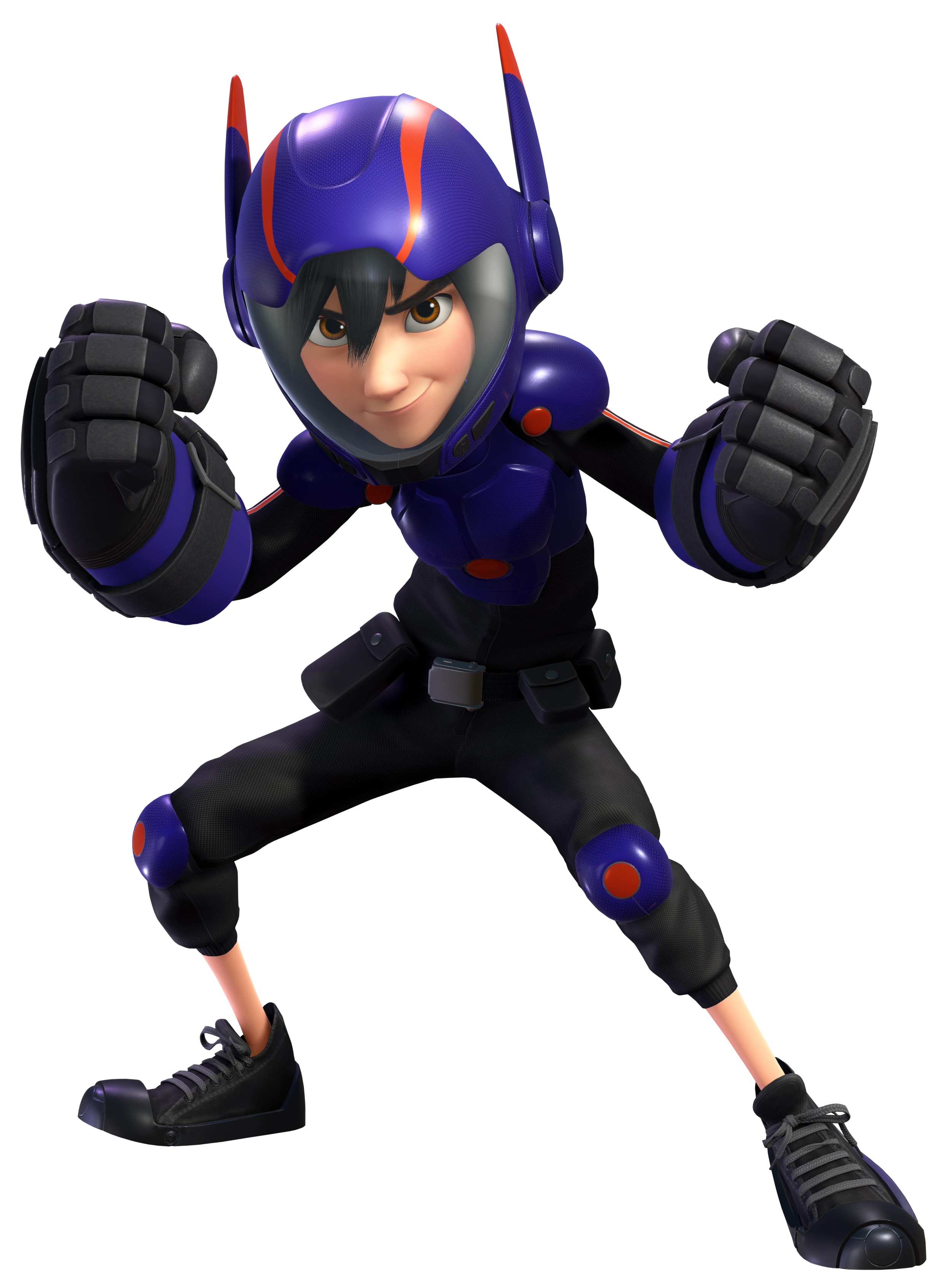 Hiro's super-suit is made of primarily purple with red accents and black armor, with black clothing underneath that covers most of his body up to his knees, and steel-toe black sneakers. On his suit are red magnetic pads, used to carry onto Baymax's armor for transportation and battle purposes. Hiro's super-suit received a few alterations in the TV series. His sneakers have been replaced with black steel-toe combat boots, the pockets on his belt are gone, his black pants fully cover his legs and his visor is transparent orange.