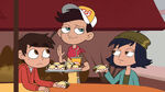 The four arrive to collect tennis balls to pay off for Janna's hat, during which Tom has a heart to heart talk with Marco about Star. He tells him that he is okay with him deciding to go out with Star because of how close they are. When Marco points out that they removed the curse of the Blood Moon, Tom tells him that he knew that that was never the real reason why he loved Star. The three of them, finally pressure Janna to get to the point of how she got to Mewni and, possibly for the first time ever, breaks down and admits that she is incredibly stressed out by being taken for granted by her friends due to her personality. They apologize and offer to take her out to lunch at Britta's Tacos, where Oskar, in an aloof nature, does not realize he was supposed to ban Janna.