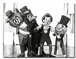 The first Jiminy Cricket costume featured a large head and a short body with inoperable arms. He has a gray hat with a black stripe on it, a black jacket, and a small white umbrella on his left hand. | ||