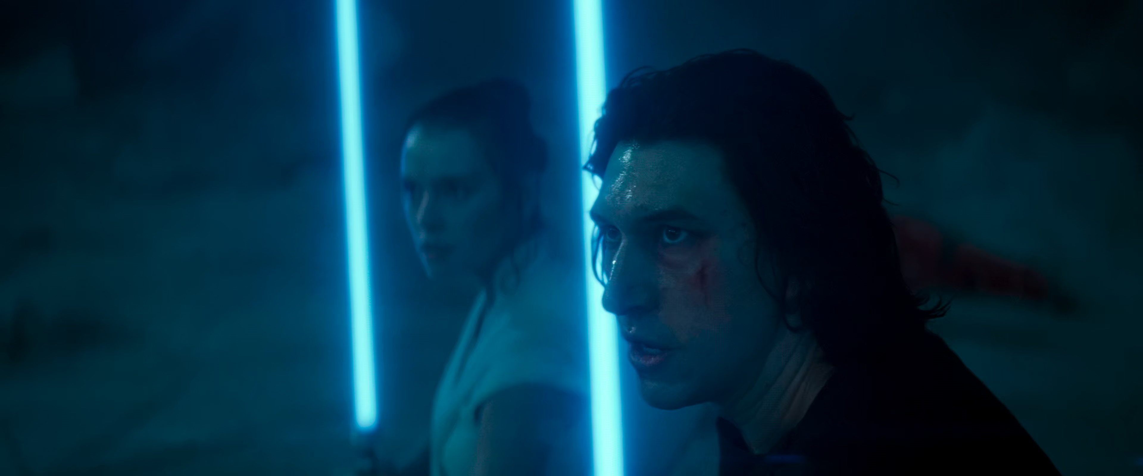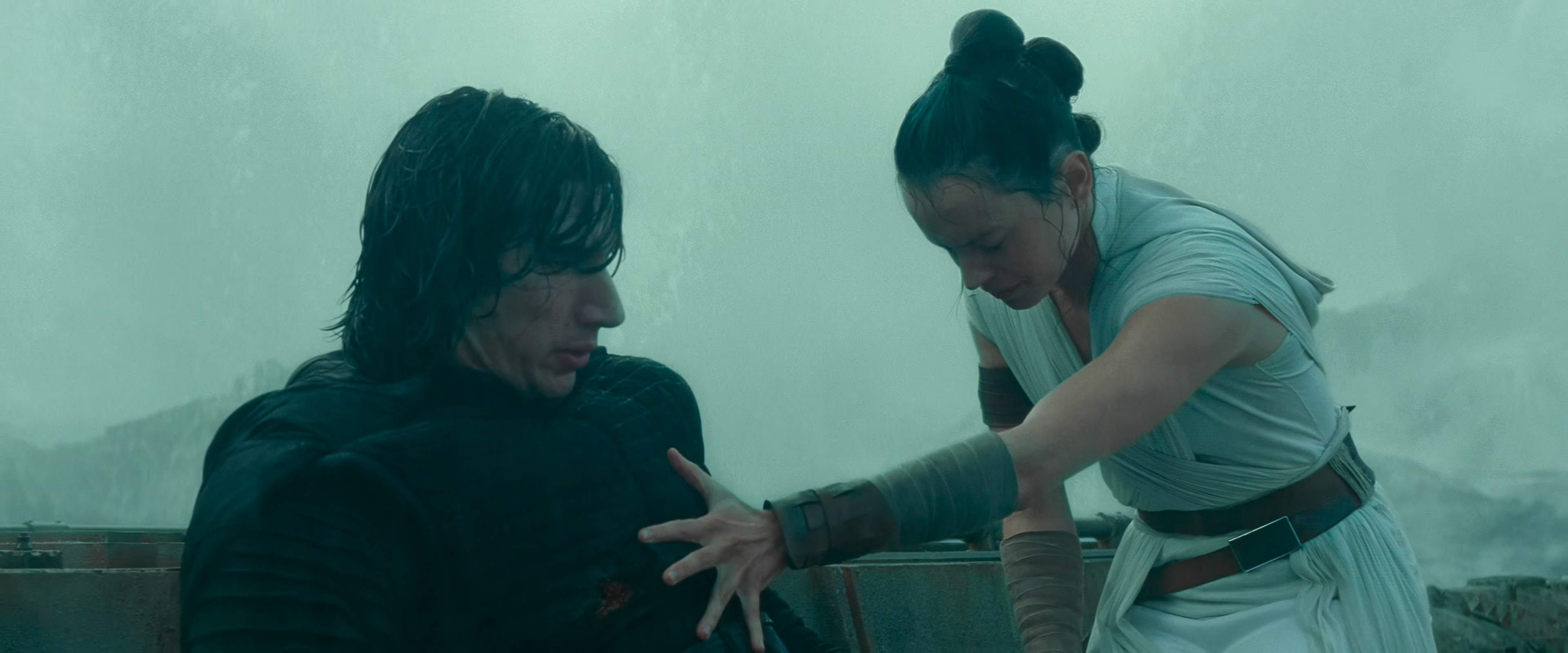 Regretting her act of rage, Rey heals Kylo and confesses her feelings for him.