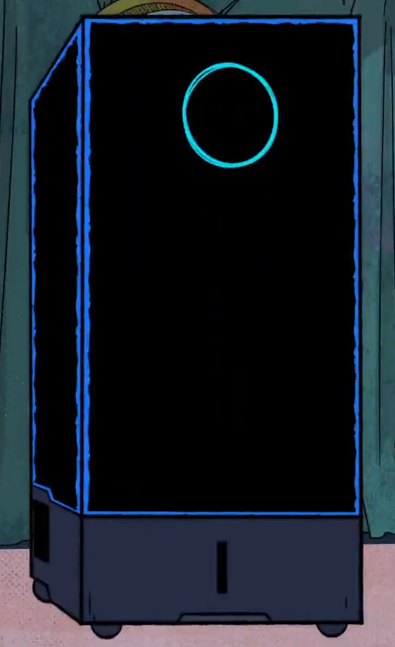 LOS, to put it simply, is a tall black box with blue lining that sits atop a processor on wheels. They communicate via a blue circle that moves about and changes shape and design to emphasize how LOS feels.