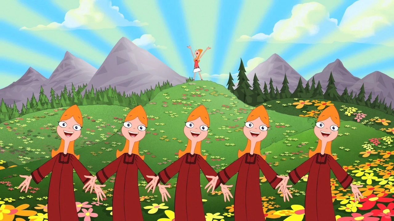 - If one looks closely during Give Up, when everyone walks by the old fashioned army men in between the artist and the driver, Candace appears for about one frame even though she already walked of the screen.