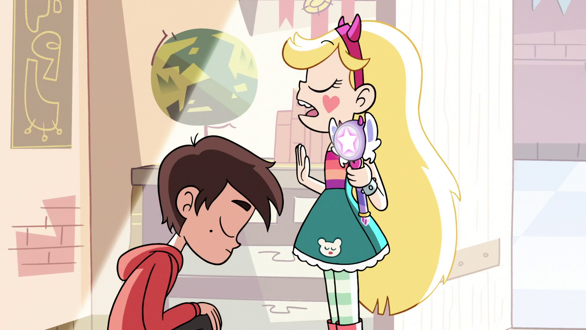Star enters the laundry room where she learns that Marco is in the lint catcher. Upon entering, she finds him in combat with a giant lint monster. The two team up to fight it as well as turn on the fan to defeat it. After exiting, Star apologizes to Marco and tells him that things have changed since he left and that she has been trying to be the best princess she can be. Marco admits that it was wrong to come without telling her, but when he tries to leave, Star instead takes him to another part of the castle and recreates his bedroom back on earth while also bringing the laser puppies. Marco is ecstatic and Star decides to make him her official squire.