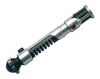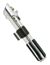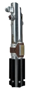 | At the age of thirteen, the design of Anakin's first lightsaber had a blue plasma blade, chunky controls, and thick ridges on the handle. While fighting his way through the battle droid foundries on Geonosis, Skywalker had his lightsaber destroyed by a mechanical cutting arm. This saber was later used as the reference for rebuilding his Sith lightsaber upon his becoming Darth Vader. | |