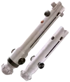 Obi-Wan's third lightsaber featured a much more skeletal make. The emitter was separated from the body of the weapon by a bronze and brass cut-back, thin "choke" portion which also held the reserve power cell. Immediately below this slim bar was the black ridged handgrip, which occupied the central third of the hilt. The activator was throttle-style, the same sort featured on Anakin Skywalker's second lightsaber. The covertec wheel was black held onto a rigged black extension. Finally sealing the hilt was a chrome emitter. During Obi-Wan's exile on Tatooine, the lightsaber was adjusted in sections so that parts were black. This weapon was lost after Darth Vader killed him on the Death Star. He also wrote down instructions for creating a lightsaber. He based the schematics provided off his own, which resulted in the lightsabers created from the instructions bearing a strong resemblance to his weapon, starting with Luke Skywalker's. | |